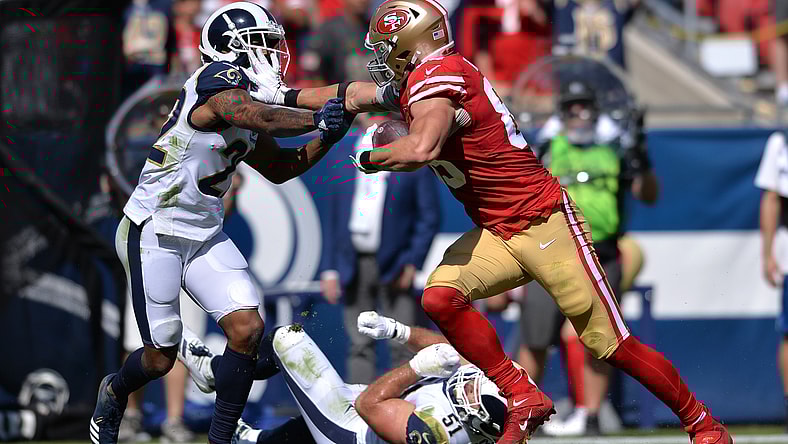 Of course the one everyone’s talking about right now is the unreal George Kittle catch and run that gave the San Francisco 49ers their game-winning field goal opportunity against the New Orleans Saints. In fact, you could make the argument that Kittle is the current NFL stiff-arm king.