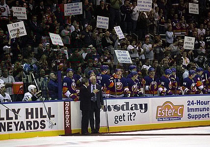 The numbers of retired players and the banners commemorating the New York Islanders four Stanley Cups were installed at UBS…