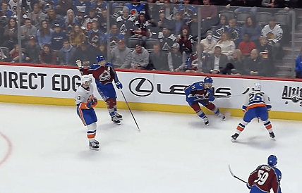 New York Islandesr forward Mathew Barzal was on his way to the penalty box but Avalanche defenseman Cale Makar showed…