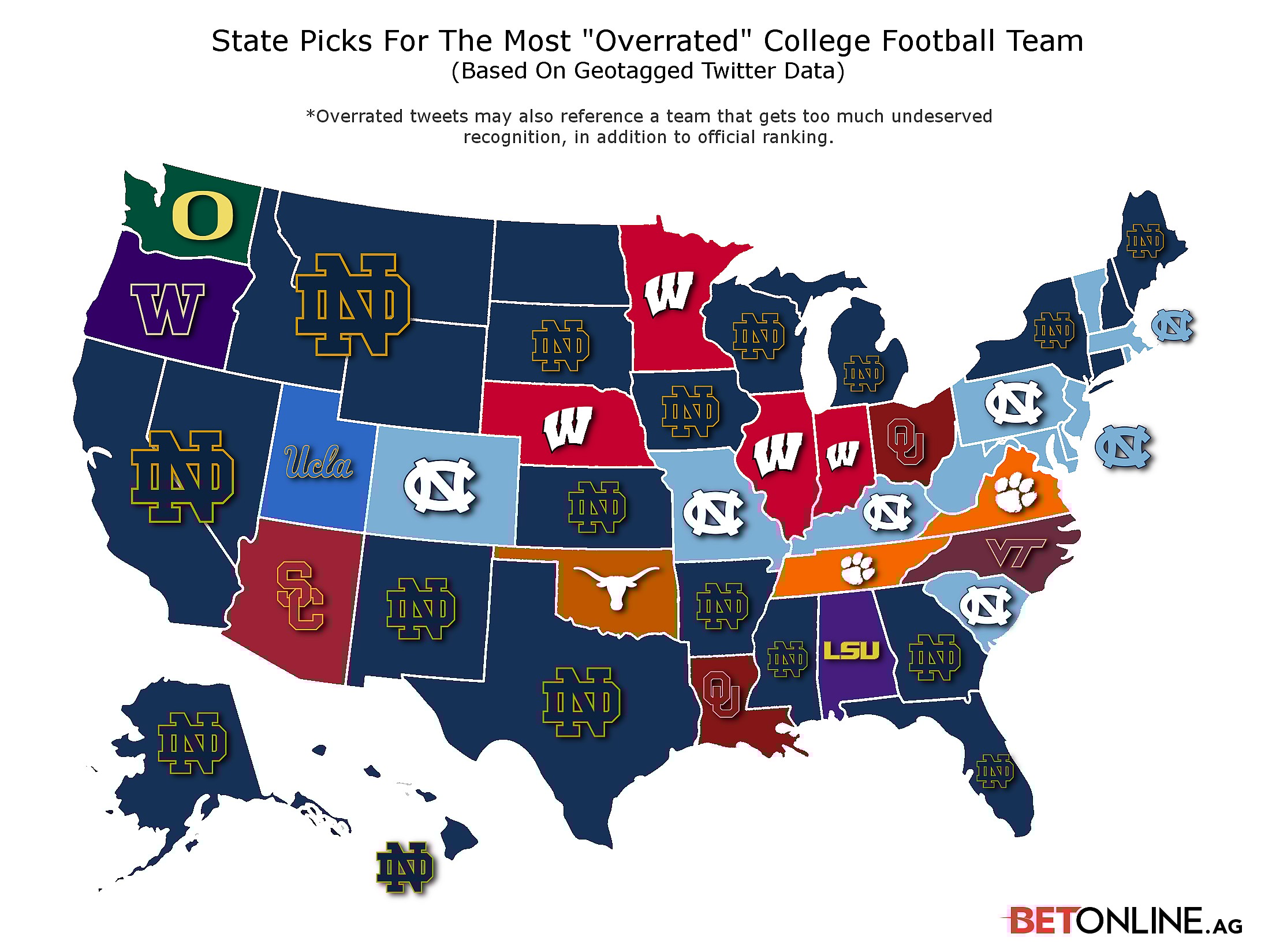 A Twitter poll using data from BetOnline.ag found that 23 states arrived at the conclusion that Notre Dame was college football’s most overrated team, as can be gleaned from the map below:
