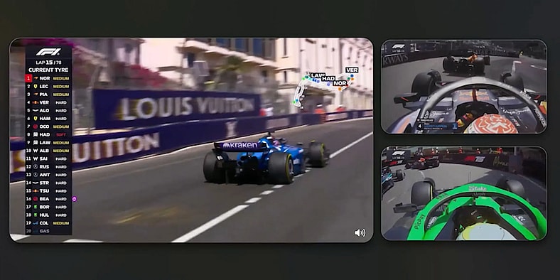 But the bigger shift is what’s underneath the main broadcast. Apple TV offers up to 30 simultaneous live feeds across all sessions — Driver Tracker for a bird’s-eye view of the race, real-time telemetry, a mixed onboard feed that automatically switches between driver cameras as the action unfolds, and Podium feeds that dynamically follow the top three throughout. Fans can watch up to four feeds at once through Multiview, with preconfigured team layouts or fully customized setups. Apple Vision Pro users get five simultaneous feeds.