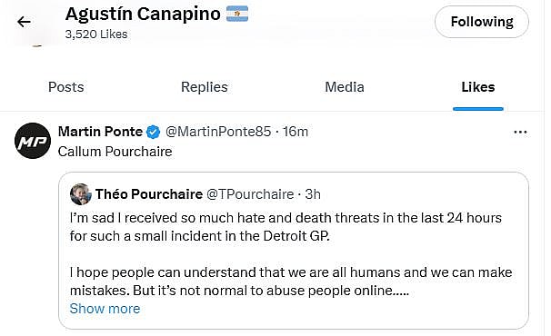 Canapino also ‘liked’ a quote retweet of his statement from ESPN Latin America IndyCar commentator Martin Ponte that referred to the situation as ‘Callum Pourchaire.’ Canapino also liked several other tweets that suggested the whole incident was funny in some cases and not real in the others.