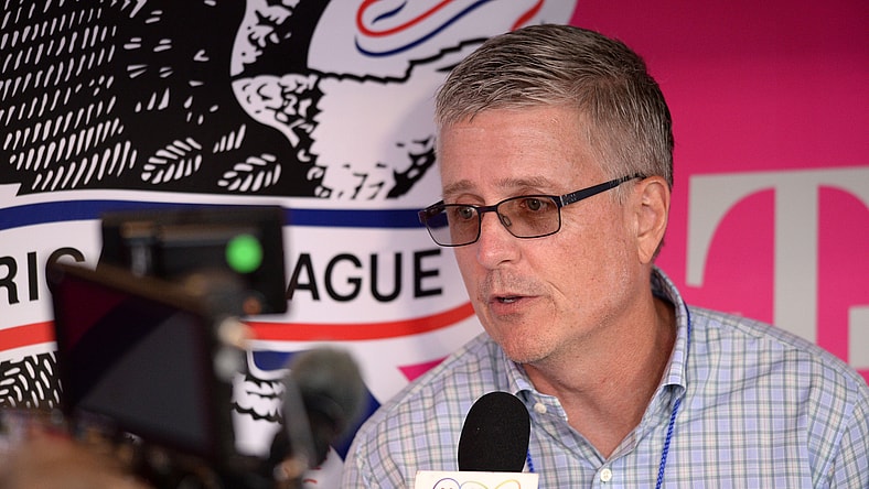 Sep 27, 2019; Anaheim, CA, USA; Houston Astros general manager Jeff Luhnow speaks to the media in the dugout before the game against the Los Angeles Angels at Angel Stadium of Anaheim. Mandatory Credit: Orlando Ramirez-USA TODAY Sports