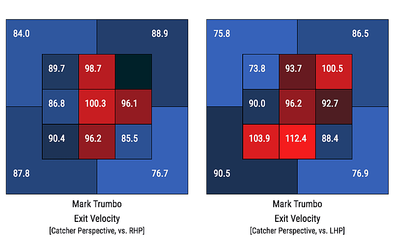 Trumbo’s furthest-hit ball of the season was hit off of six-time All-Star C.C. Sabathia. He’s just barely behind Stanton with that ball measuring in at 118.5 mph, but if you look at the comparative exit velocity between the two, it’s intriguing, Trumbo typically starts out stronger right out of the gate.