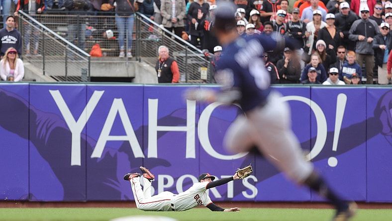 With San Francisco up 8-7 and two outs in the bottom of the ninth against the Milwaukee Brewers, Yastrzemski went all out to save the game. Check out this diving catch the outfielder made.