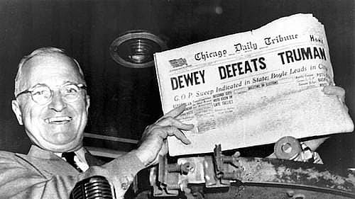 With a divided party and dwindling popularity, Democratic incumbent Harry Truman seemed quite vulnerable. So vulnerable, in fact, that The Chicago Tribune printed a now infamous “Dewey Defeats Truman” headline on election day for publication in the following day’s paper.