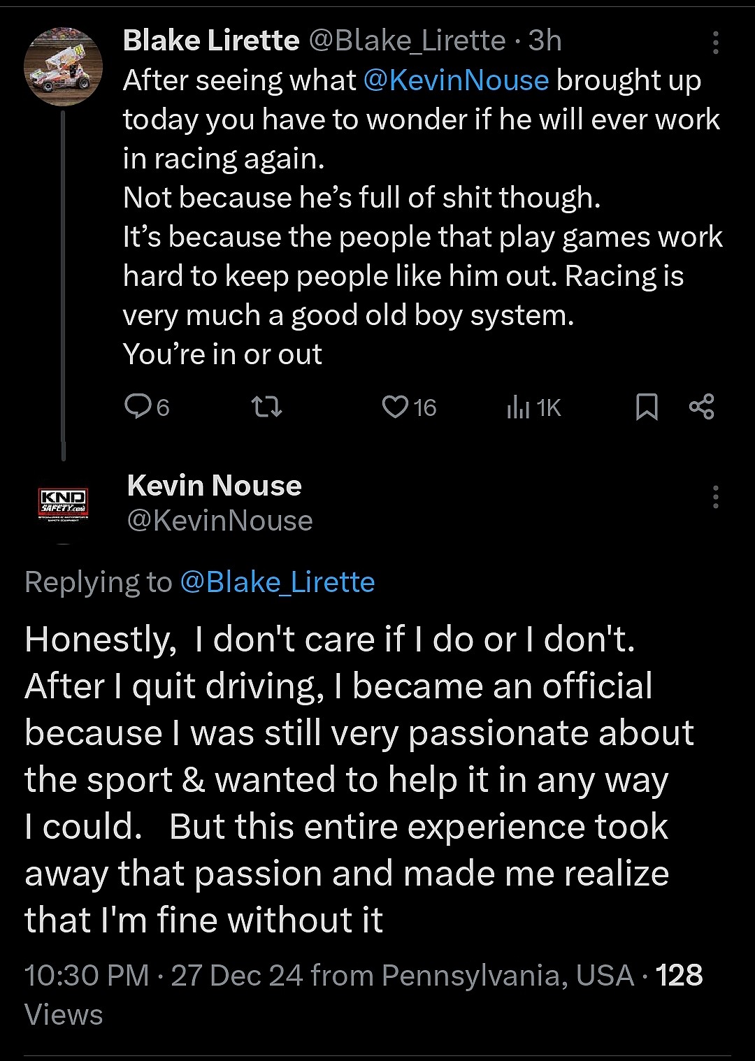 “It’s not my intention to damage anything concerning Sprint Car racing,” Nouse said. “I have nothing against High Limit, the World of Outlaws or anyone else.
