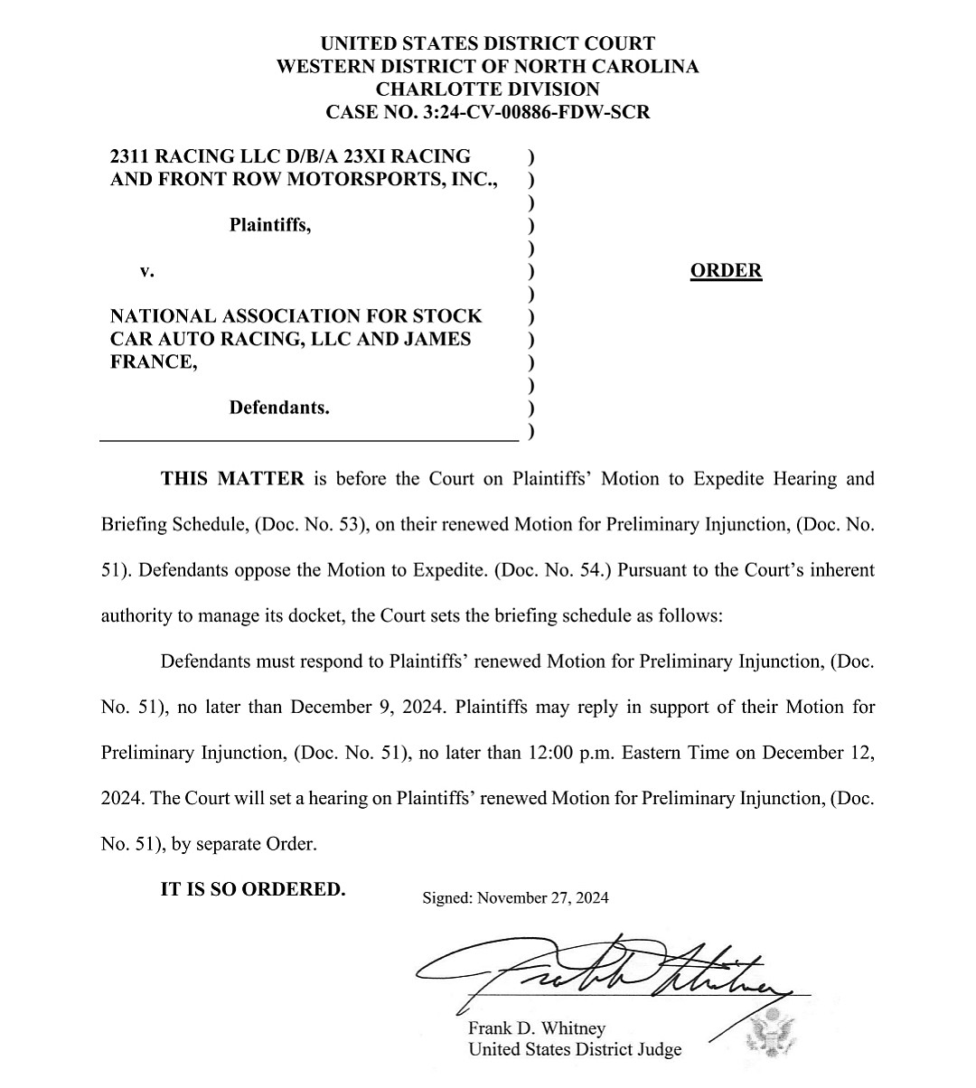 Update: Judge Whitney sets next dates in second preliminary injunction process. NASCAR response is due December 9. 23XI and Front Row reply due by noon on December 12. The court will then set a date for oral arguments.