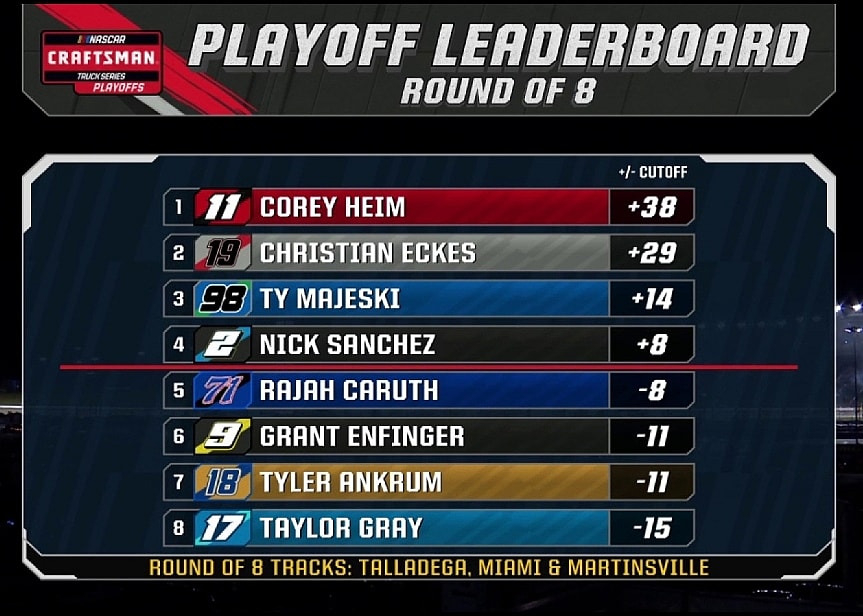 Despite it all, Enfinger lived to fight another day with a ninth-place finish on Friday night at Kansas Speedway. At the same time, two-time and defending champion Ben Rhodes was eliminated alongside Daniel Dye because they had awful races at Bristol and then Kansas.