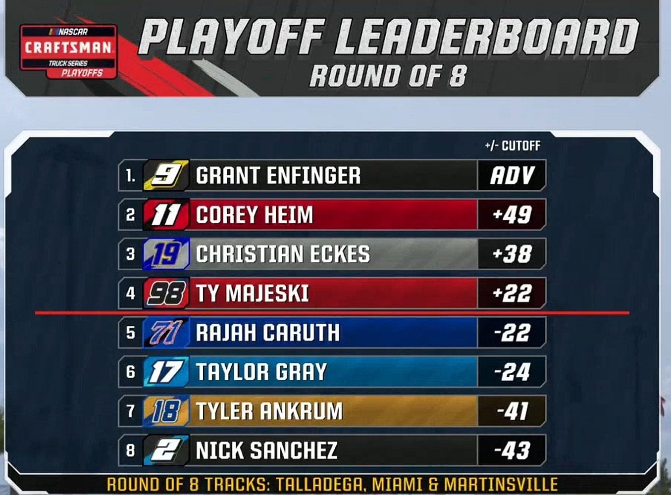 And like on the Cup Series side, any of those teams below the cutline winning would also bump the lowest in points without a win down one position, meaning the 16-point deficit from Ty Majeski to Christian Eckes could become relevant at Martinsville too.