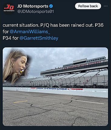 Robert Dorman, the tire specialist for the small budget team, also embraced race weekend tweeting duties for the organization this season and saw an opportunity for a timely post when rain canceled qualifying for the most recent race on Saturday at the New Hampshire Motor Speedway.