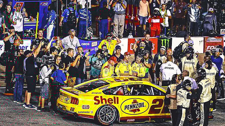 In real time, Logano drove down pit road and came across the Richard Childress Racing No. 3 pit crew celebrating directly across from the start-finish line, and the two-time champion responded by throttling up, breaking traction, and burning out on a live pit road.