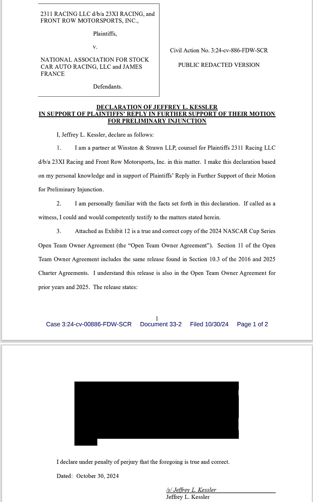 In the latest filing over its pursuit of a preliminary injunction that would allow them to compete in the Cup Series through the duration of its lawsuit against NASCAR, 23XI Racing and Front Row Motorsports argued that choosing to run as an open team would also forfeit its legal standing over antitrust claims against the Sanctioning Body.