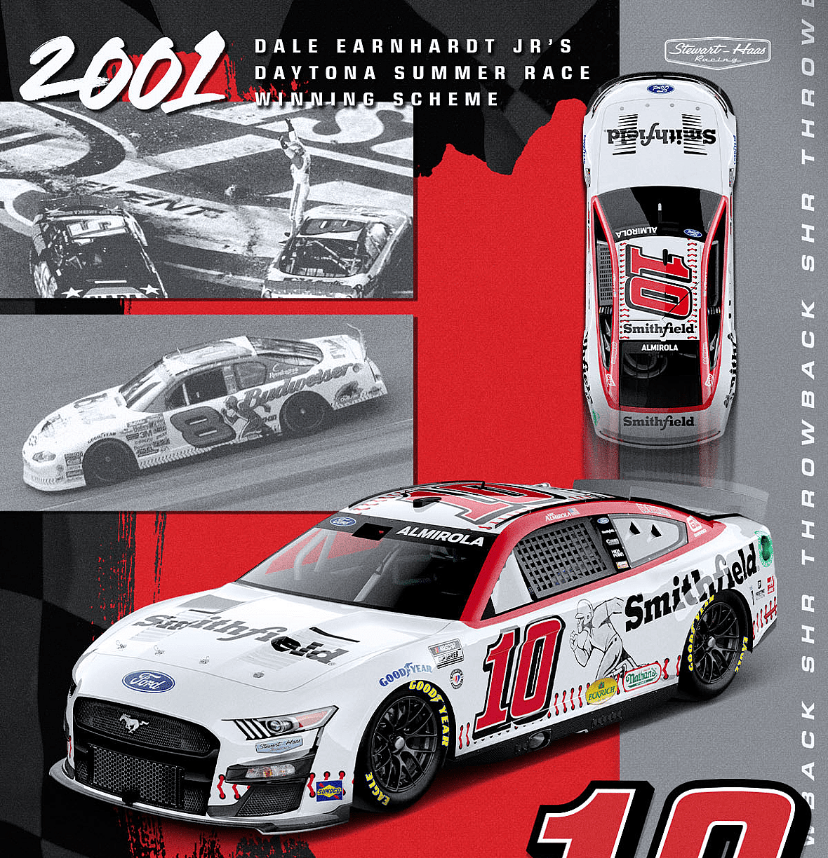 Aric Almirola will throw back to Dale Earnhardt Jr.’s winning paint scheme at the 2001 Daytona Summer Race. It was NASCAR’s first race at Daytona International Speedway since the tragic death of Dale Earnhardt Sr.