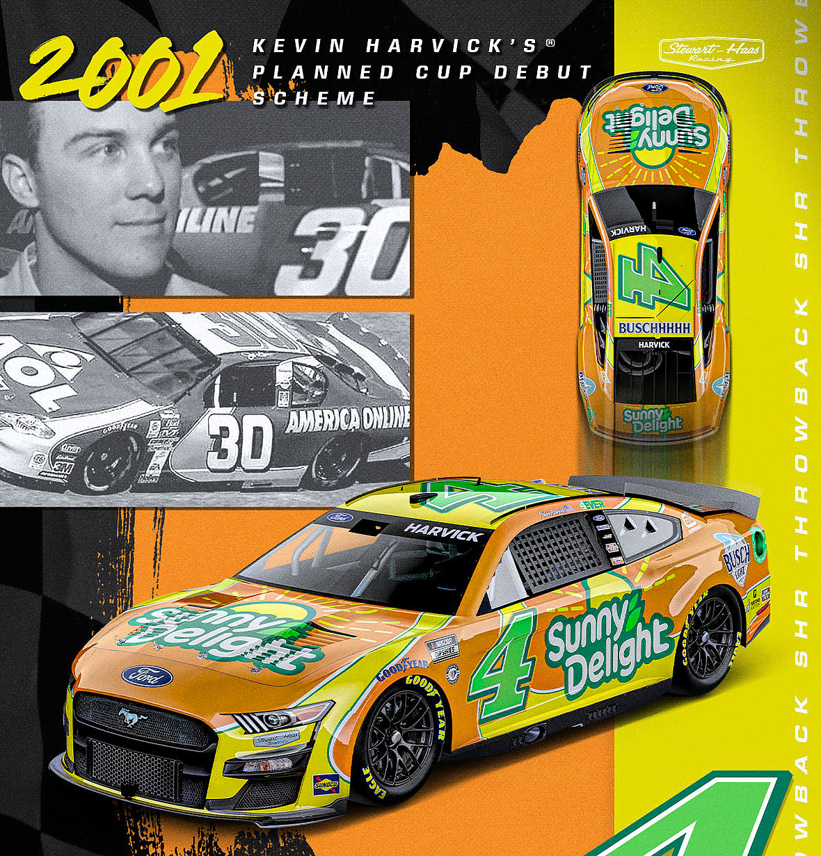 Kevin Harvick will throwback to his planned NASCAR Cup Series debut paint scheme before he was called to drive the No. 29 car for Richard Childress Racing. It will be Harvick’s final throwback paint scheme as he will retire at the conclusion of the 2023 season.