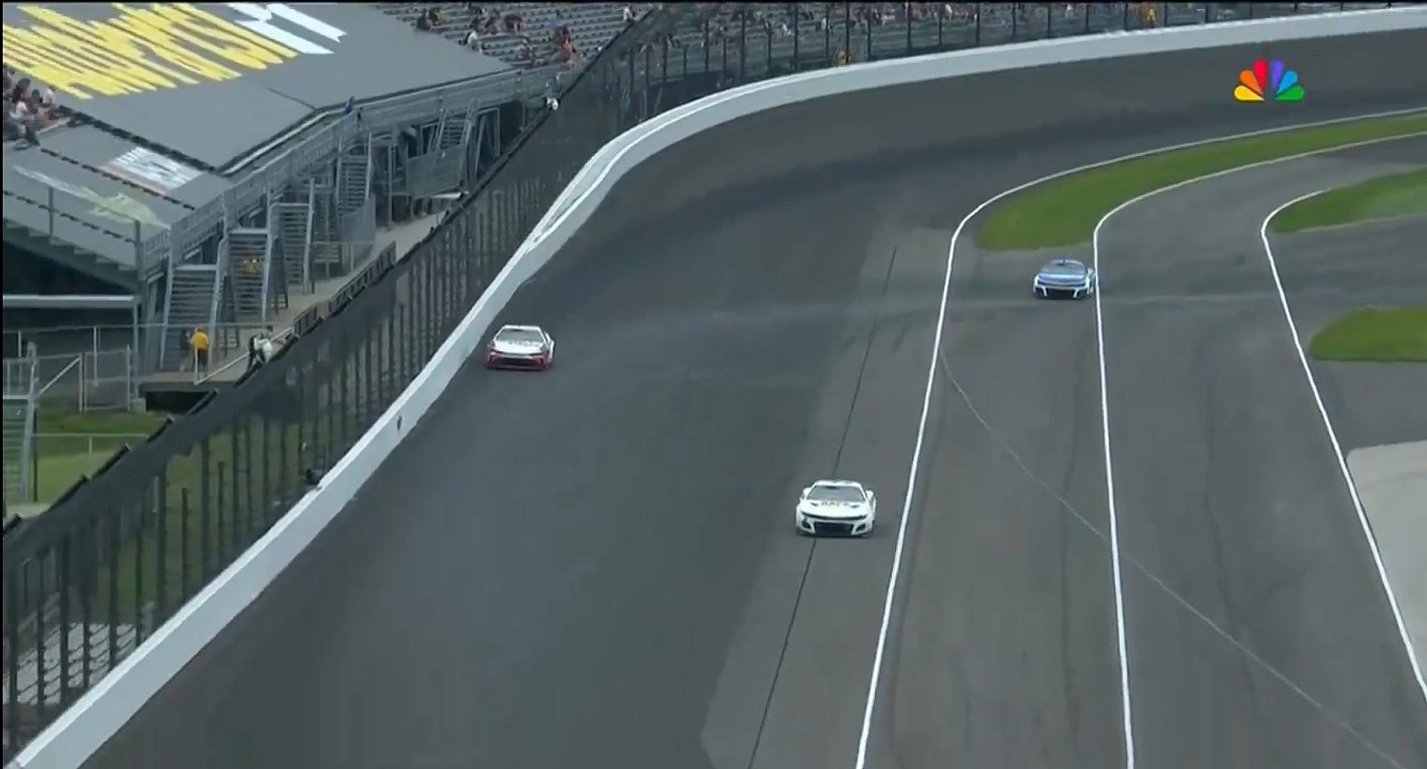 Ryan Preece ran out of fuel, and slowed in Turn 2 where he was spun by Chase Elliott, into the grass with a flat left rear tire.