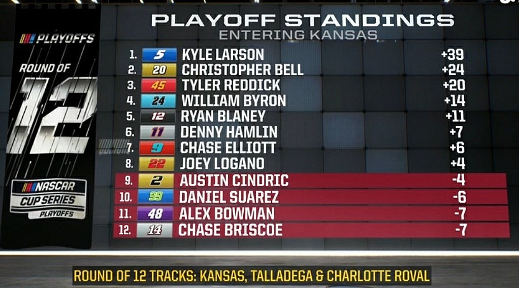 Larson, who won at Kansas in the spring, is relieved that this race is first because he can add to that points advantage early instead of having to play from behind, a lot like Denny Hamlin and Chase Briscoe had to in the first round.