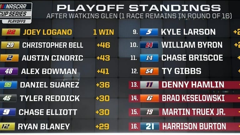 Below the cutline are former champions Brad Keselowski and Martin Truex Jr. but also one of the winningest drivers of all-time in Denny Hamlin. Three of the four Joe Gibbs Racing drivers are on the playoff bubble.