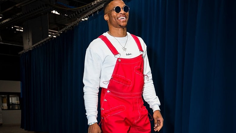 Russell Westbrook clocks in for the @okcthunder! #NBAStyle
