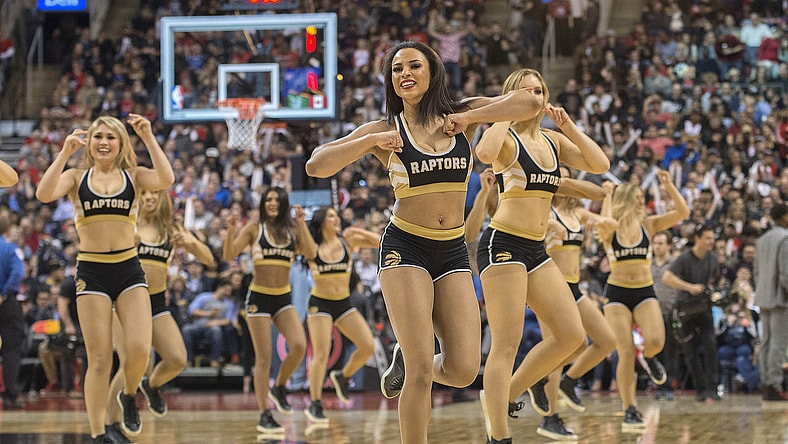 Apr 2, 2017; Toronto, Ontario, CAN; The Toronto Raptors Dance Pak perform during the fourth quarter in a game against the Philadelphia 76ers at Air Canada Centre.The Raptors won 110-105. Mandatory Credit: Nick Turchiaro-USA TODAY Sports