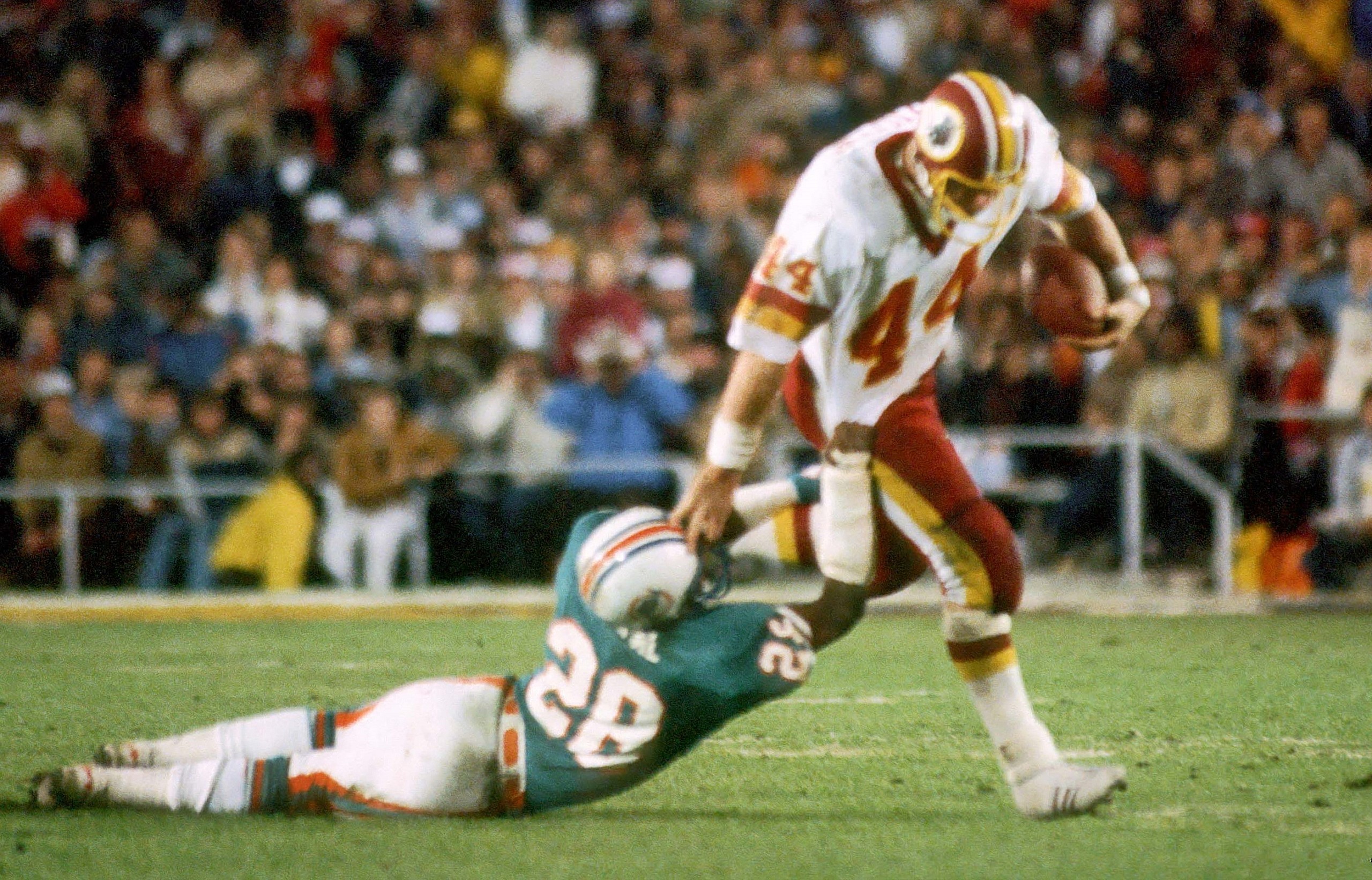 Riggins not only got a first down; he went the distance. He easily shed Dolphins cornerback Don McNeal, who tried the arm-tackle the powerful running back, and Riggins burst untouched 43 yards to the end zone to give Washington the lead for good in a 27-16 victory.
