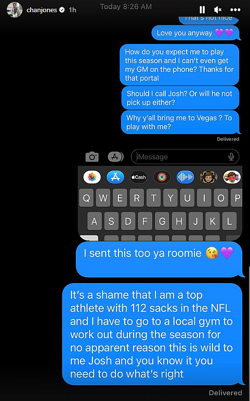 He also posted a screenshot of an apparent text exchange with his head coach where he claims, “How do you expect me to play this season and I can’t even get my GM on the phone?” He also wrote, “It’s a shame that I am a top athlete with 112 sacks in the NFL and I have to go to a local gym to work out during the season for no apparent reason. This is wild to me Josh and you know it, you need to do what’s right.”