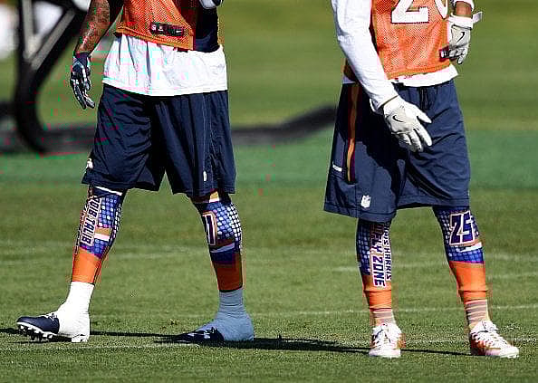 Several Broncos secondary were spotted wearing these colorful, custom tights labeled with “No Fly Zone” on the left leg.