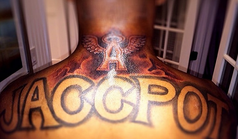 In addition to the Washington Nationals tattoo on his right tricep, DeSean Jackson got a Los Angeles Angels logo tattooed on the back of his neck. Only 30 more teams to go Jackson. Looks like Benjamin Christensen has some competition.