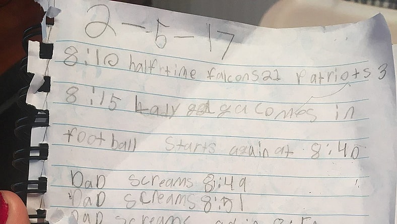 The girl jotted down this list of her dad’s reactions that went from being thrilled at one point to crying at the endĀ of the game.
