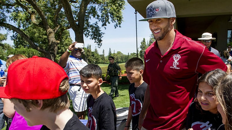 San Francisco 49ers’ quarterback Colin Kaepernick makes a young receiver celebrate a winning touchdown.