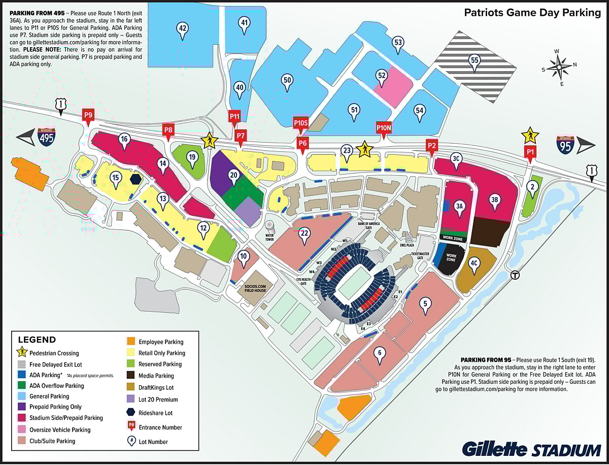 Ticket Holders can save time accessing Gillette Stadium parking lots by purchasing prepaid parking passes, which include ease of access through the toll booths and, more importantly, guaranteed parking on the stadium side of Rt.1 for all home games regardless of when you arrive. The cost of parking is $50, and the lots open four hours before kickoff.