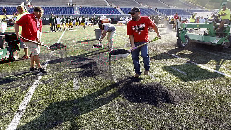 In addition to the concrete-like hardness found on portions of the field, the mid-field logo was reportedly as tacky as taffy.