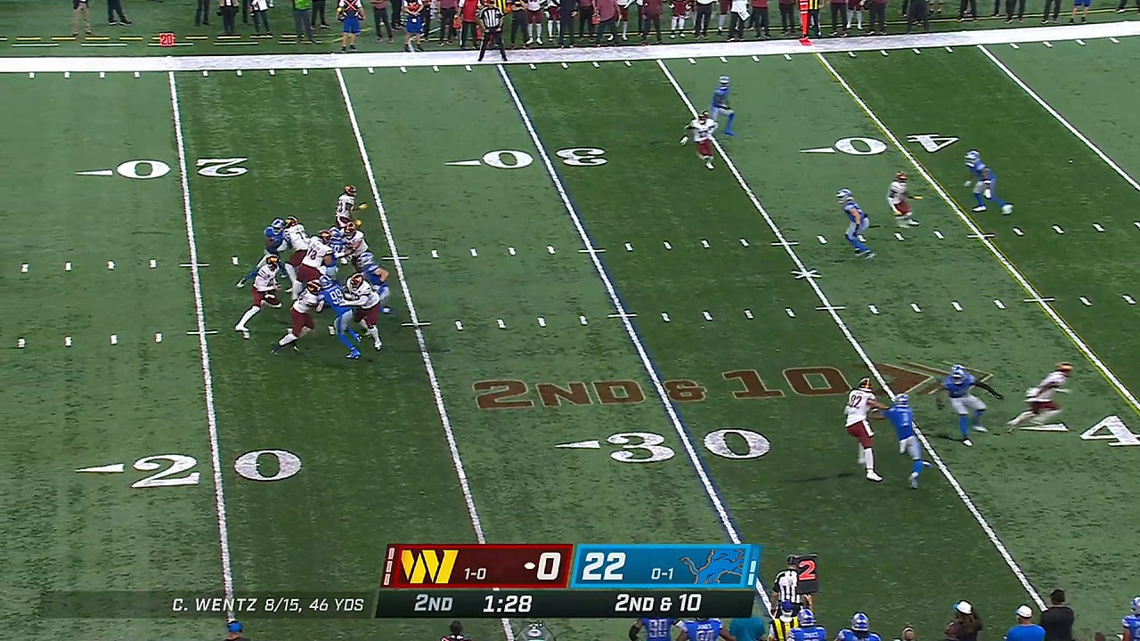 The Lions had exactly one impressive drive in the first half; an effective, 9-play, 77-yard drive. But because of the Commanders’ general ineptitude, this resulted in a 22-0 lead. They needed Carson Wentz to fumble out of the end zone and get a 52-yard kick return to get things going.