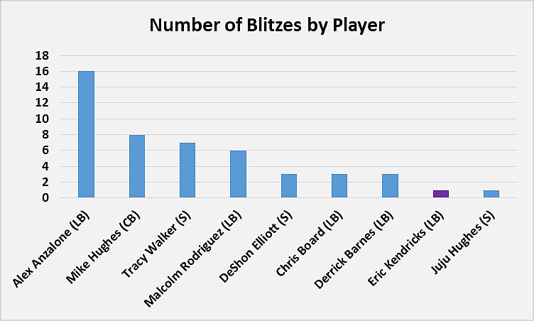 The best graphic we can come up with is to chart how many teams each player has blitzed; this chart includes all non-DL/Edge player blitzes for both the Lions and Vikings: