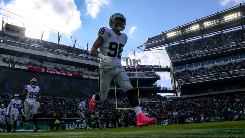 We do think Maxx Crosby will request a trade this offseason, convincing the Las Vegas Raiders to move him to a contender. While the Detroit Lions are a popular pick as his landing spot, we are projecting the All-Pro edge rusher to land with another NFC contender. The Tampa Bay Buccaneers are likely looking at a narrow window for contention, with a core that is aging if Mike Evans and Lavonte David are re-signed. Crosby would be a monumental upgrade for the Buccaneers’ pass rush, giving them a difference-maker whose very presence would also help the likes of Vita Vea, Calijah Kancey, and Yaya Diaby. Las Vegas picks up premium draft capital and moves Crosby to the NFC, while the Buccaneers land a player who could help them compete for the NFC crown next season.