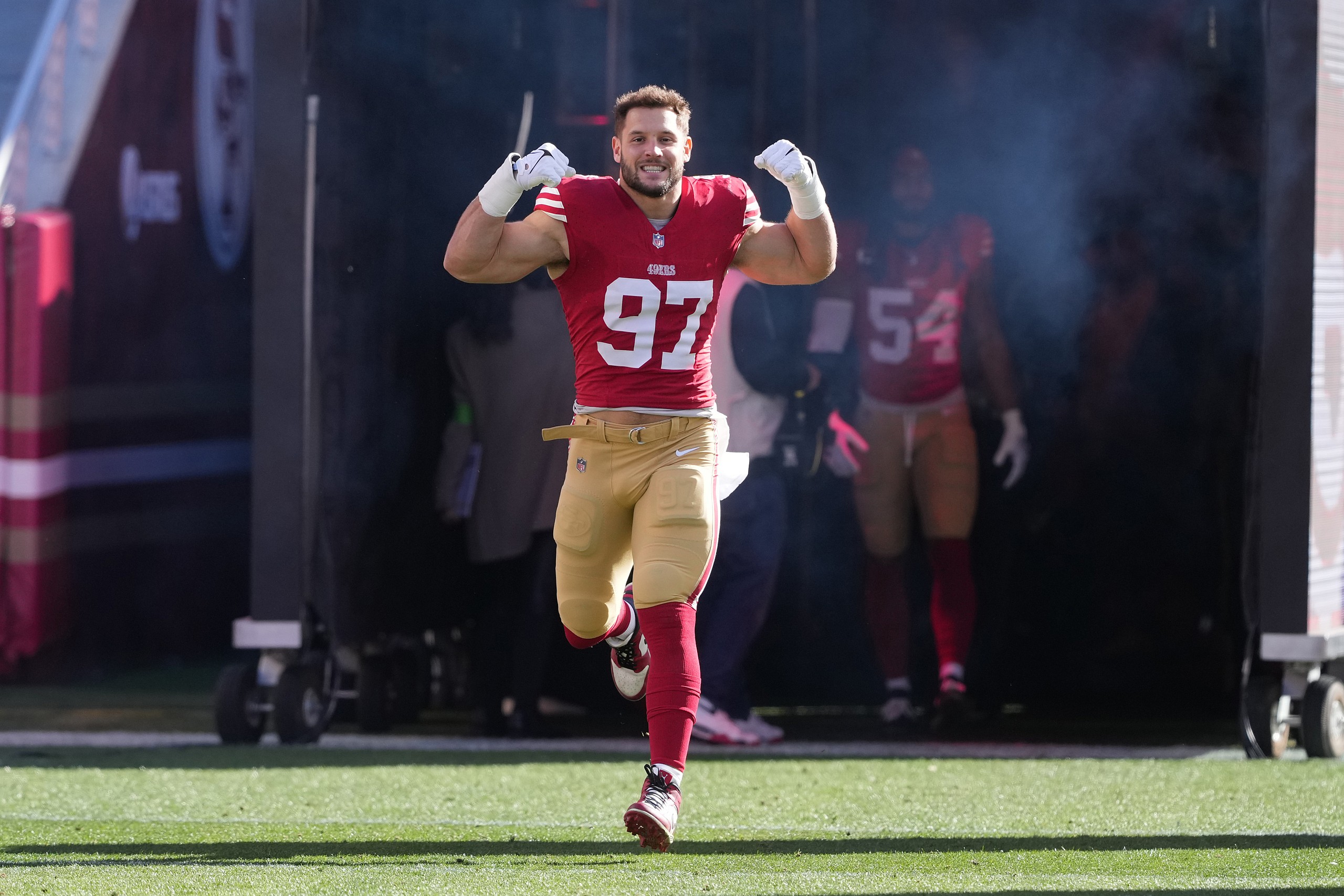 He also finished tied for first in QB knockdowns (21) with Aidan Hutchinson, second in QB hits (35) and fifth in pressures (44). In the 49ers’ two playoff games, Nick Bosa has two sacks — both coming against Detroit’s Jared Goff in the NFC Championship Game — seven QB hits, six hurries and five tackles.