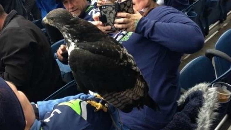 So the Seahawks flew away from its handler and landed on the lady next to me!! See!! pic.twitter.com/osf4fgVpK4