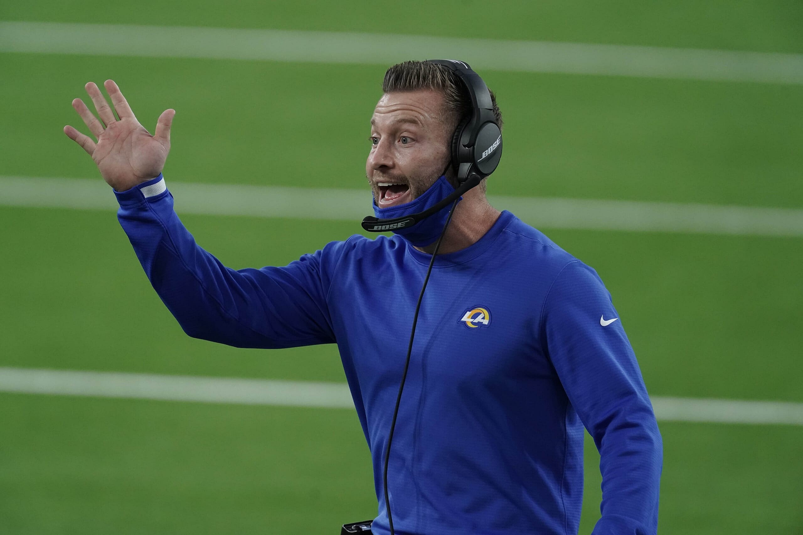 Oct 26, 2020; Inglewood, California, USA; Los Angeles Rams head coach Sean McVay reacts in the first half against the Chicago Bears at SoFi Stadium. Mandatory Credit: Kirby Lee-USA TODAY Sports