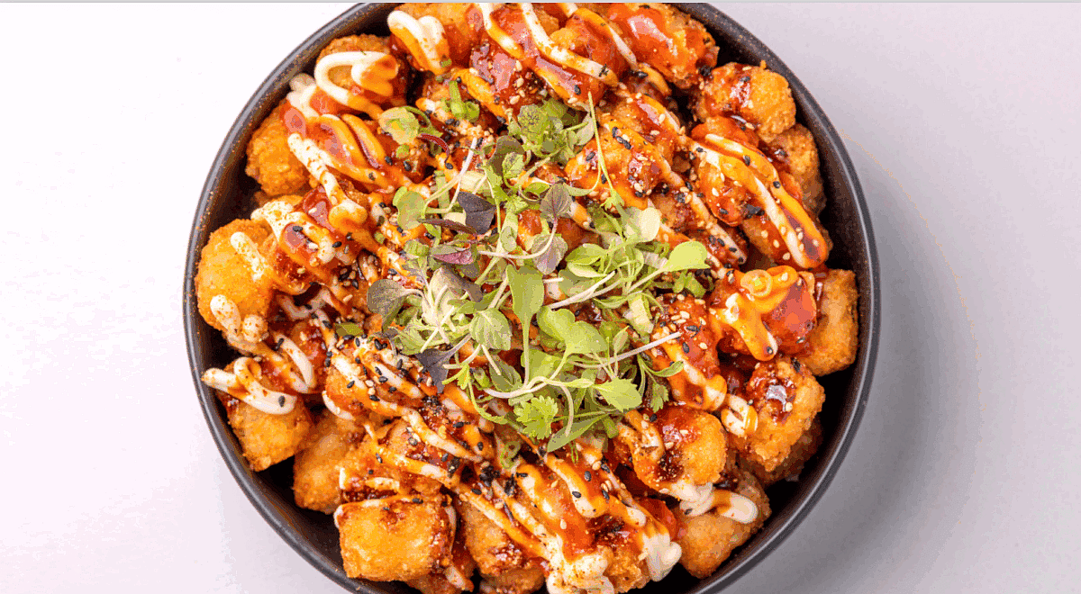 • Sawtelle: Sesame ginger salad, crispy chicken strips, crispy chicken sandwich, hot dogs, Tsunami tots, soda, water, beer, and more.
