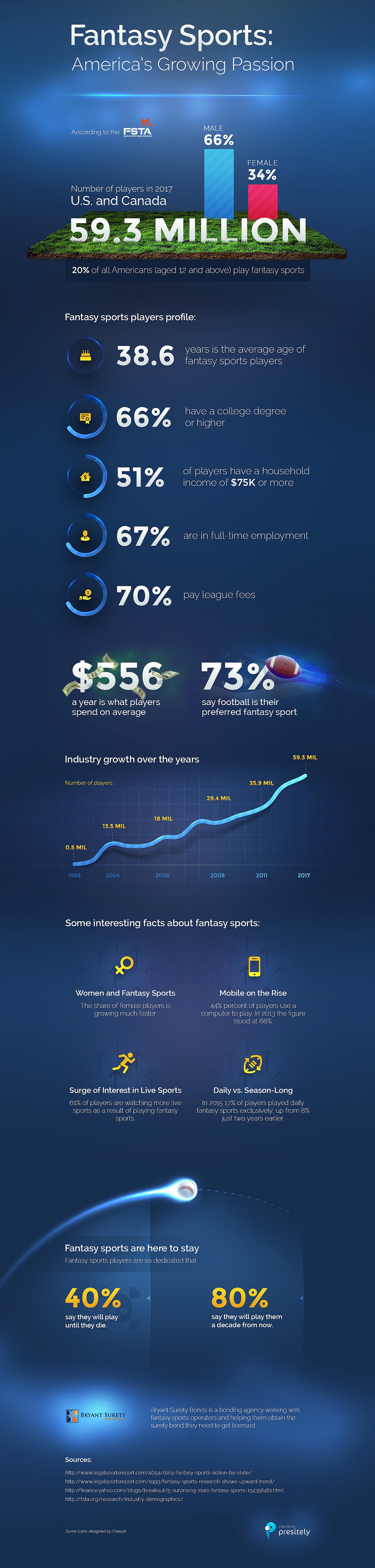 These figures come from Bryant Surety Bonds, who has been tasked with helping fantasy sports operators within the industry. Even more so than the 20 percent, there are some other interesting numbers to focus on here. A total of 40 percent surveyed indicated that fantasy sports will be a life-long passion for them. And over the course of the past three decades, the number of fantasy players has increased from a half million to nearly 60 million.