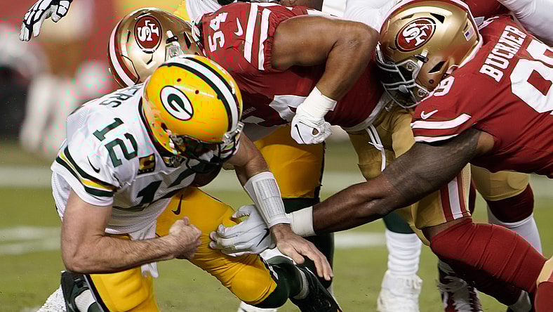 On the fifth play of Green Bay’s opening drive, Rodgers dropped back on 3rd-and-10. He was immediately under pressure from multiple angles as San Francisco’s pass rushers got through. As Rodgers attempted to get out of trouble, Fred Warner wrapped him up and forced a fumble (watch here).