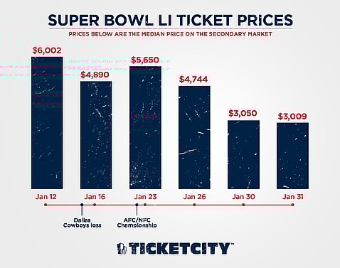 According to this graph from TicketCity (h/t CBS Sports) ticket prices on the secondary market for Super Bowl LI fell dramatically after the Cowboys were eliminated.