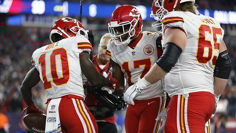 After struggling through the past three games (by his standards), we were all waiting for Hill to break out big time. He did just that in Kansas City’s narrow 43-40 loss to New England last Sunday night. After a slow start to the game, Hill came on big time. He recorded seven receptions for 142 yards and three scores, including this go-ahead touchdown in which Hill made the Pats’ defense look absolutely silly.