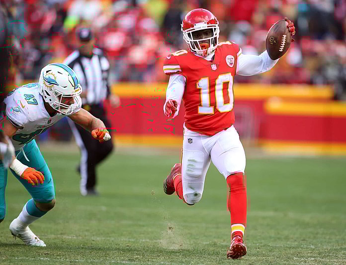 We’re honestly running out of ways to define what this young receiver brings to the table. Hill made his impact known almost immediately in what would ultimately be a 38-28 Chiefs win over the Los Angeles Chargers on Sunday. It started with this 91-yard punt return for a touchdown to open the scoring in the first quarter. Later in that opening stanza, Hill caught a 58-yard touchdown from Patrick Mahomes for Kansas City’s second score of the game.