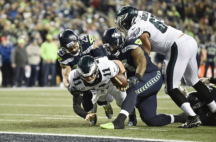 With 24 touchdowns and just three picks during Philadelphia’s nine-game winning streak heading into Sunday Night Football, this second-year signal caller was playing better than any quarterback in the NFL. That came to a screeching halt in a big way against Seattle.