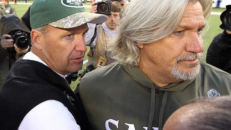 11/3/13 - New Orleans Saints vs. New York Jets at MetLife Stadium - New York Jets head coach Rex Ryan greets his brother New Orleans Saints Defensive coach Rob Ryan after the Jets defeated the Saints 26-20.