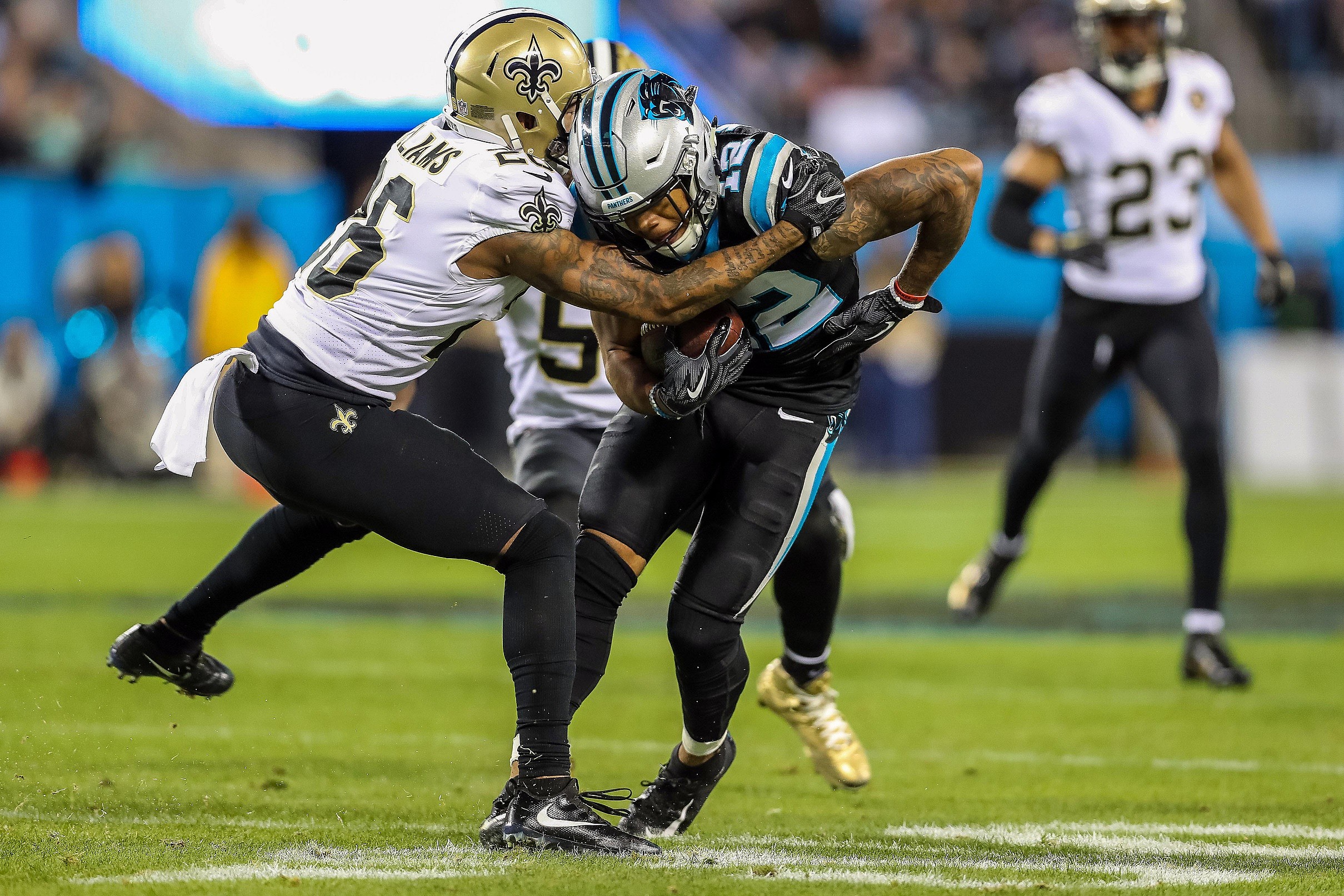 Safety Eric Reid probably had his best night as a Panther in this one. His mano-y-mano tackle of Alvin Kamara in the red zone saved a touchdown in the first half. He was flying around all night long making big plays, both behind the line and back deep.