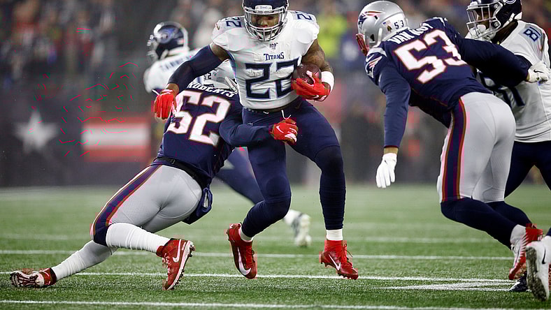 Jan 4, 2020; Foxborough, Massachusetts, USA; Tennessee Titans running back Derrick Henry (22) runs against New England Patriots middle linebacker Kyle Van Noy (53) and outside linebacker Elandon Roberts (52) during the second quarter at Gillette Stadium. Mandatory Credit: Greg M. Cooper-USA TODAY Sports
