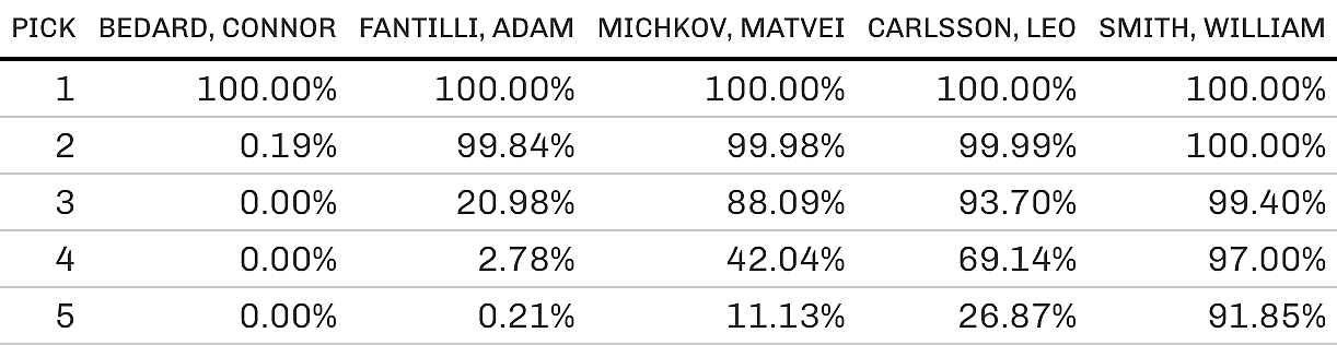 – There’s a 21.0% chance Fantilli, the Canadiens’ second-ranked prospect, is available, so his value is multiplied by 0.210.
