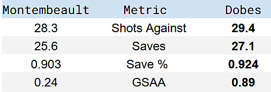 The biggest difference is their average goal allowed distance (feet). Opposing players are scoring from a little over 20 feet out versus Montembeault, while Dobes’ average allowed goal is five feet further out.